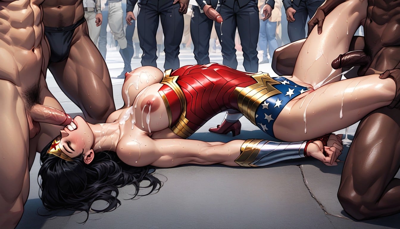 wonder woman, tiara, bracelets, red bustier, red knee length high heeled boots, wearing star spangled panties, held down by her wrists, held down by her ankles, fucked in her pussy, long messy black hair, alleyway, covered in cum, sweaty thighs exposed, (breasts exposed: 1.3), cum on breasts, cum dropping down chin, cum dripping, ultra detailed, detailed face, used roughly, held by throat, arched back