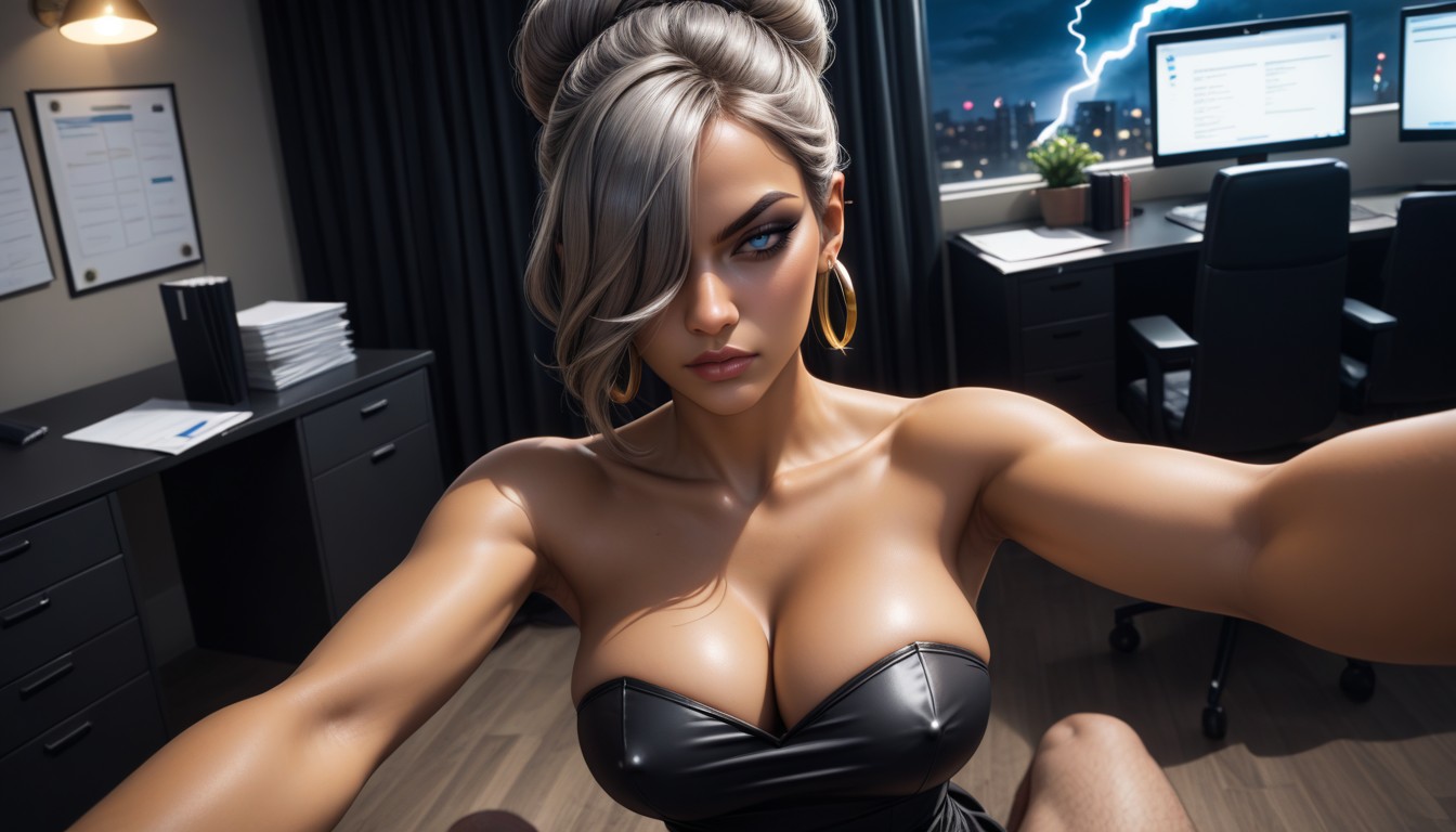 (Noir: 1.3), (office: 1.3), (night: 1.3), sexually explicit details, high definition, (hair bun: 1.1), gold hoop earrings, (hair over eye: 1.3), (hair behind ears: 1.3), (strapless black dress: 1.3), erect nipples, sitting on office chair, (POV: 1.3), looking at viewer, perky breast, focused on breast, lightning, she a slut that needs the dick, fat man