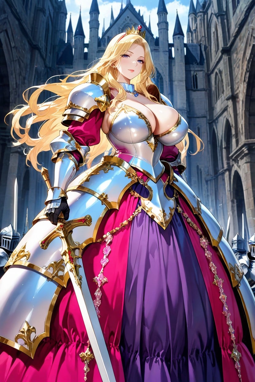In public, wearing armored dress, princess knight, princess, fully clothed, fully armored, no skin showing, wearing armor, fancy princess armor, wearing fancy princess dress, extremely intricate dress, giant hoopskirt, wide hoopskirt, gigantic skirt, armored skirt, covered breasts, breasts completely covered, royal face, beautiful face, holding sword, castle background, front view, close up shot