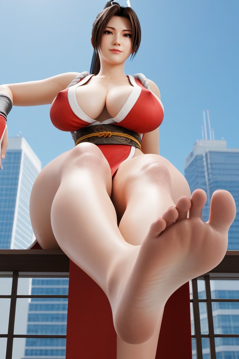 3d, Game high graphics, Mai Shiranui, 1girl, White skin, brown eyes, brown hair, long hair, parted bangs, ponytail, cleavage, covered big breasts, Big breasts, mature female, bare hips, pelvic curtain, arm guards, sleeveless kimono, rope, cleavage, sexual body, waist, bare feets, feet toes focus perfect face, georgeous body, aesthetically pleasing image. bare feets, showing soles, sitting, from below, soles, foot sole focus, perfect, lewd, sexy pose, legs up, stunning beauty, foot fetish, perfect soles of the, ultra detailed soles of the, glossy soles of the, with five toes, close up