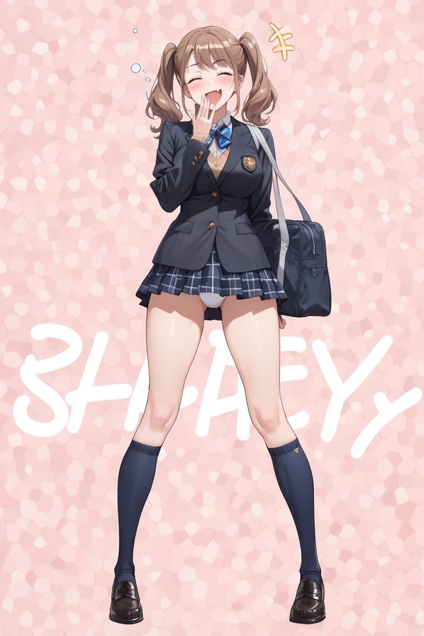 1 woman, solo, female, cheeky, smug, (hair-closed eyes: 1.2), :D, black blazer, looking for viewer, standing, rib socks, panties visible, fang, high twintails, hand near mouth, pleats miniskirt, (long legs: 1.2), sports bag, (navy blue high socks: 1.2), black loafers, perfect anatomy, (white panties: 1.3), detailed face, detailed panties, panties stain, schoolyard, hd, full body, 4K, 8k